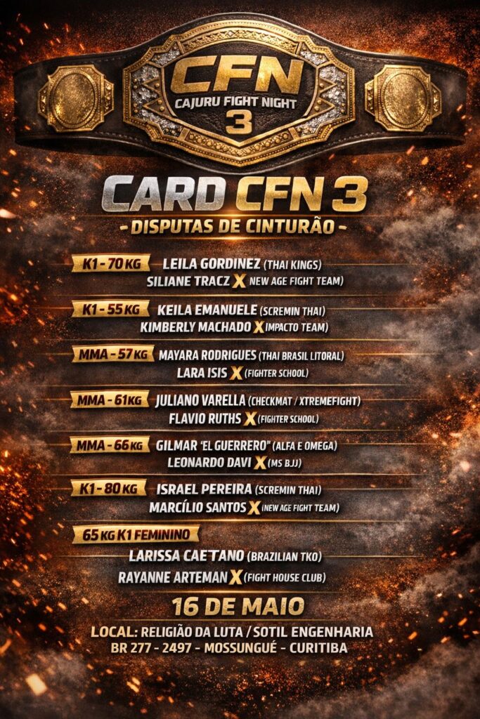 Cajuru Fight Night divulga primeiros duelos valendo cinturão na terceira edição Faltando três meses para a realização de sua terceira edição, o Cajuru Fight Night dá início à divulgação oficial do card e apresenta sete confrontos amadores que terão disputa de cinturão, reforçando o caráter competitivo e técnico do evento. Destas lutas anunciadas, quatro serão […]