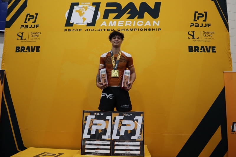 O jovem talento Enzo Yamasaki brilhou no Pan-Americano da Professional Brazilian Jiu-Jitsu Federation (PBJJF), realizado em Maryland, nos Estados Unidos, ao conquistar as medalhas de ouro no peso e no absoluto da faixa-marrom com e sem kimono. O feito ganha ainda mais destaque pelo desempenho dominante diante de adversários de alto nível.